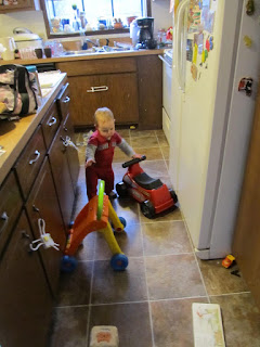 (1/23) I was home with the kiddos today. It was Kathy's turn to volunteer in the classroom, so Jax came over during the littles' nap time. He helps me find the puzzle pieces that always seem to scatter throughout the living room during the day. The boys had a good nap, and then joined us to play a little until C got home. We then had to pile in the car to go in for the twin's 15-month appointment. Here are their stats: D 23lbs (30%); 31" (50%); Head 47.75cm (69%); J 23lbs (30%); 30.75" (49%); Head 48.25cm (79%). D wasn't very steady on the scale, so we guessed at 23lbs. He feels heavier than J. But who knows... My perception has been off before. They got one shot (Hib), and D complained loudly. J squawked and then was ready to get down and play with the Duplos. The Dr. looked at everyone's ears and pronounced us good to go. We had a relaxing rest of the evening.